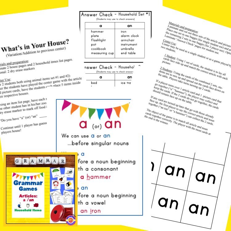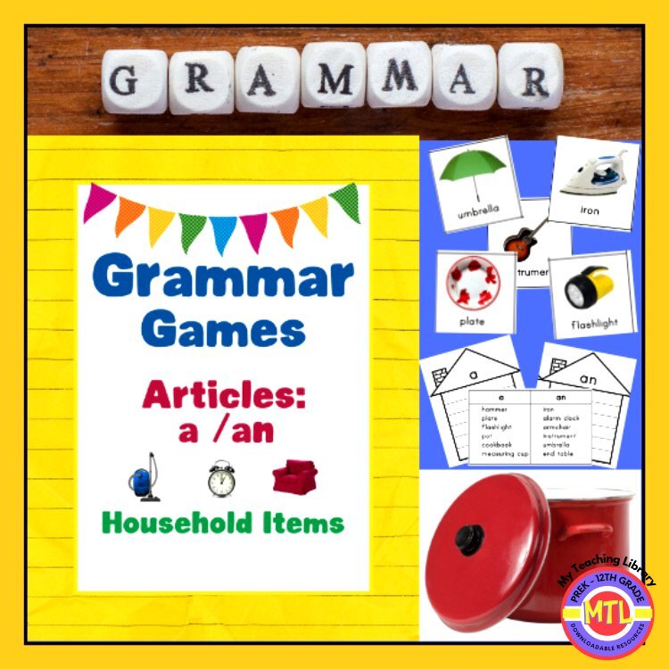 ⭐This Language Arts download includes a poster explaining the correct usage of the articles ‘a’ and ‘an’, and two different center activities. I have several grammar game editions – This one is the Household Set edition.