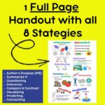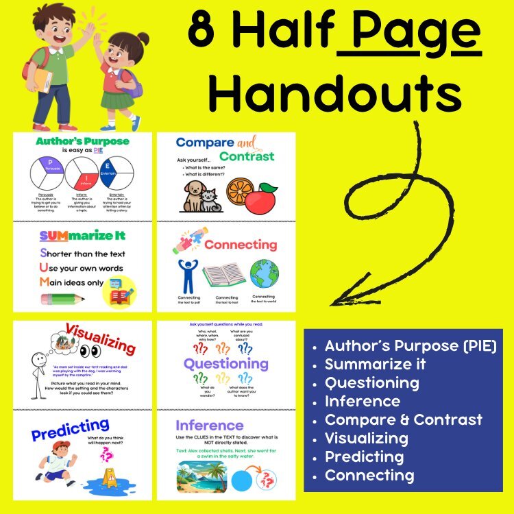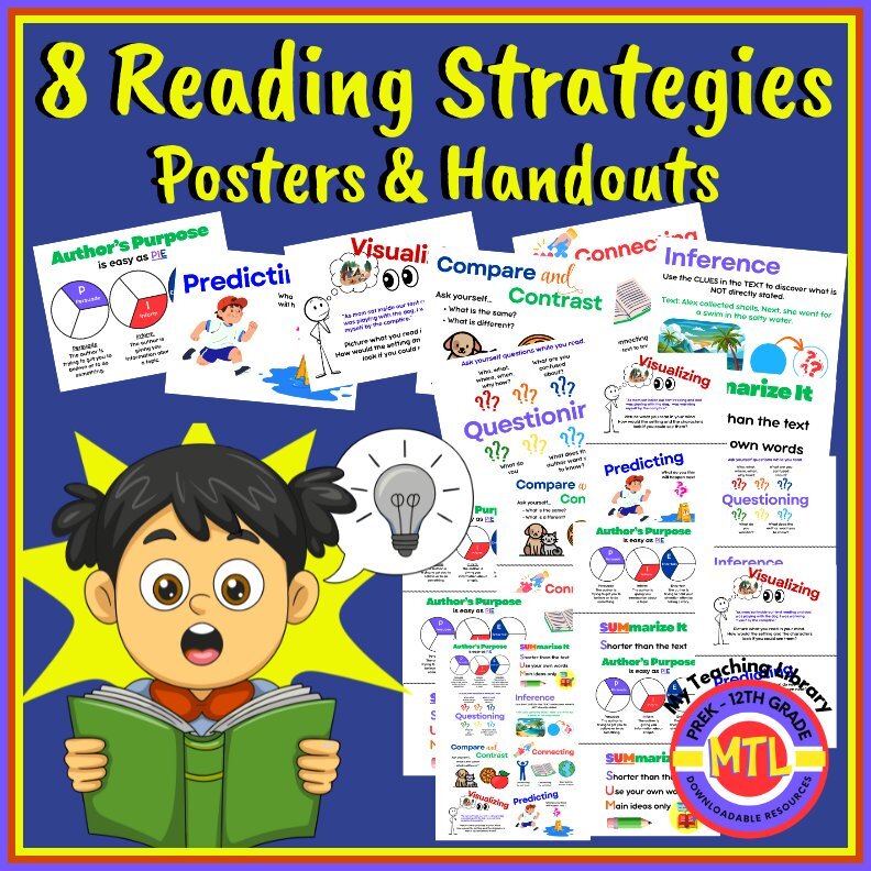 Colorful and eye-catching reading comprehension strategy posters and handouts that will help readers connect and understand what they are reading. When using these strategies, students will be actively engaged in and analyzing the written text. They will activate prior knowledge, seek to understand the author’s purpose, ask questions (about characters, setting and events), predicting, visualize, infer, summarize, compare and contrast and question.